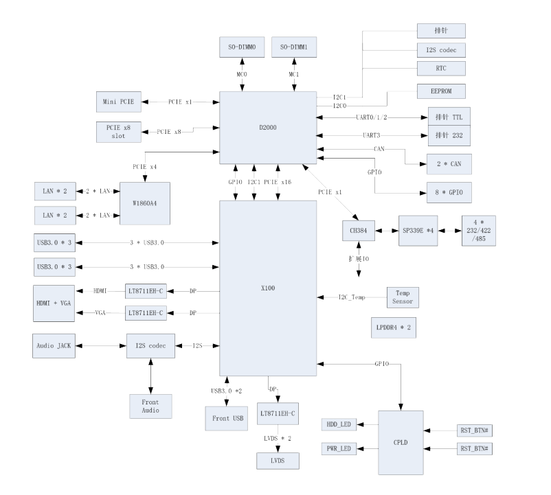 | 2组RS232/RS422信号, 2组RS232/RS422/RS485信号(由PCIe转串口芯片扩展,芯片为CH384) | ||