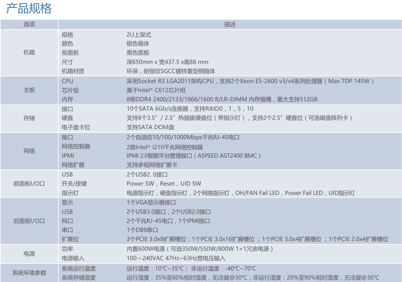 ⚫ 双路至强CPU系统,支持两个Intel® E5-2600 v3/v4系列CPU,强大的处理能力