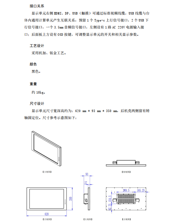显示单元搭载一块 23.8 英寸液晶显示模组,220V 电压输入。具有 1 路HDMI、1 路 DP 视频接收和显示功能,最大可支持 3840(RGB)×2160 (UHD) 像素分辨率的图像显示;工作频率 60Hz,宽高比为 16:9 (宽:高),像素采用 RGB 垂直条状排列。显示区域尺寸为 527.04(W) mm × 296.46(H) mm,对比度 1000:1 (Typ.) (TM),可视角度 89/89/89/89 (Typ.)(CR≥10),通过软件可编程色彩管理轻松调整伽马校正,色彩饱和度,亮度,对比度和色彩平衡,以达到最佳的视觉效果和真实图像色彩,因其高亮度、全视角和阳光可读性而适合户外或半户外使用。