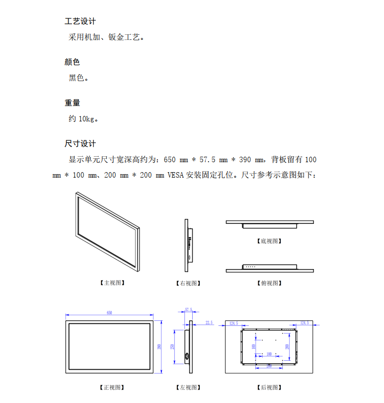 显示单元搭载一块 27 英寸液晶显示模组,220V 电压输入。具有 1 路HDMI、1 路 DP 视频接收和显示功能,最大可支持 3840(RGB)×2160 (UHD) 像素分辨率的图像显示;工作频率 60Hz,宽高比为 16:9 (宽:高),像素采用 RGB 垂直条状排列。显示区域尺寸为 596.736×335.664 (宽×高) mm,对比度 1000:1 (Typ.) (TM),可视角度 89/89/89/89 (Typ.)(CR≥10),通过软件可编程色彩管理轻松调整伽马校正,色彩饱和度,亮度,对比度和色彩平衡,以达到最佳的视觉效果和真实图像色彩,因其高亮度、全视角和阳光可读性而适合户外或半户外使用。