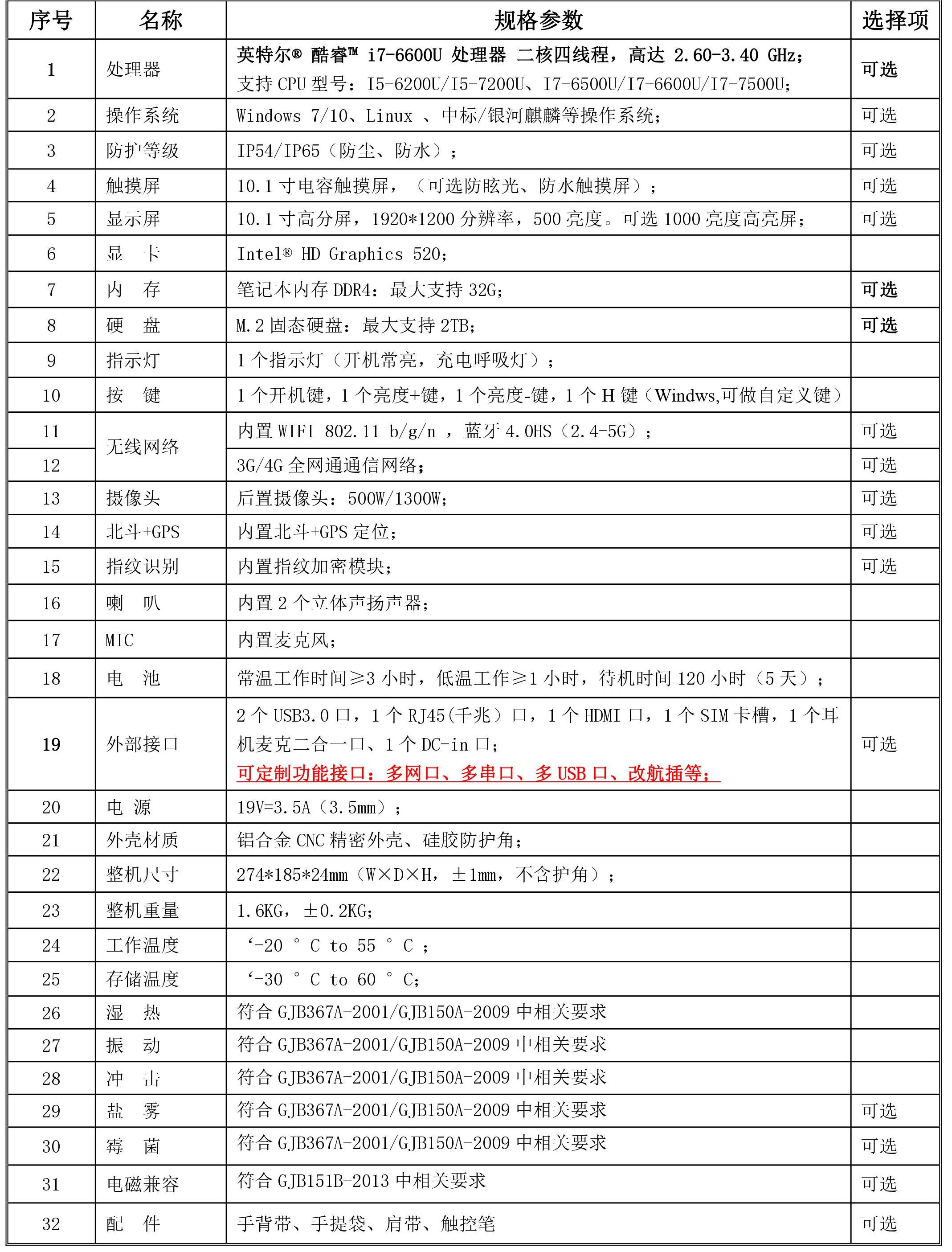 10.1 寸加固便携终端,采用高性能、低功耗、宽温平板电脑主板,大容量宽温电池续航时间 长;高清、高亮显示屏,防眩光保护盖板;丰富的主板原生扩展信号 PCIE/USB3.0 等接口,具有 强大的扩展功能、扩展空间,能为不同需求提供定制服务。加固防护,宽温设计、环节适应强, 整机经过震动、冲击、跌落、高低温等测试,可在低温下直接启动工作。